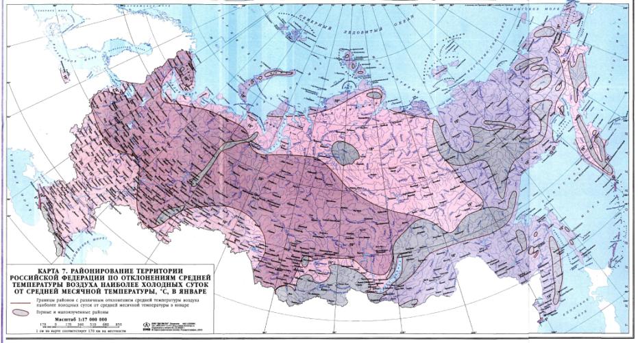 Районирование территории Российской Федерации по отклонениям средней температуры воздуха, наиболее холодных суток от средней месячной температуры,°С, в январе