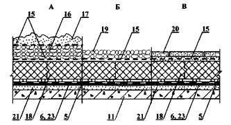 Рис. 10 Кровля, укладываемая свободно с пригрузочным слоем из гравия Эксплуатируемые кровли На рисунке 11 показаны три варианта а, б, в эксплуатируемых кровель (соответственно К-3-Г, К-3-Д, К-3-Б), используемых в новом строительстве и при ремонте. Вариант в, относится к эксплуатируемой кровле, служащей автостоянкой, над гаражами, расположенными в стилобатной части здания. На рисунке 12 изображен участок эксплуатируемой кровли (К-3-А) с газоном.
