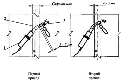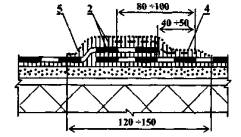Условные обозначения: 1 - ручной сварочный аппарат (фен); 2 - шлицевая насадка; 3 - прикаточный ролик 6. КОНТРОЛЬ КАЧЕСТВА РАБОТРуководство работами по устройству кровель и гидроизоляции с применением материалов НПО «Гидрол-Руфинг» должно осуществляться инженерно-техническими работниками, освоимшими технологию применения материалов: «Элона-Супер», мастики «УниМаст», двусторонней липкой ленты «ДЛЛ-Элон», «Элона-Супер Н», "Кровлелона-Е» а также наплавляемых битум-полимерных материалов "Техноэласт», «Элабит» и др.. Производственный контроль подразделяют на входной, операционный (технологический), инспекционный и приемочный. Входной контроль. При входном контроле проверяют наличие технических паспортов и сертификатов на каждую партию поступающих материалов. При необходимости качество материалов проверяют в испытательной лаборатории. Входной контроль возлагают на инженерно-технический персонал строительной организации, строительной лаборатории или специальной службы. Место выполнения - приобъектные базы или непосредственно - строительные участки. Входной контроль на участке возлагают, как правило, на начальника участка (производителя работ). Результаты входного контроля заносят в журнал входного контроля. Количество изделий и материалов, подлежащих входному контролю, должно соответствовать нормам, приведенным в технических условиях, стандартах и других документах. Операционный (технологический) и инспекционный контроль. При операционном (технологическом) контроле проверяют соответствие выполнения основных производственных операций требованиям, установленным строительными нормами и правилами, проектом конструкции кровли или гидроизоляции, а также другими нормативными документами. При операционном контроле подготовленной под грунтовку поверхности подлежит проверке: - степень ее отверждения, отсутствие отслоений, раковин и трещин, сцепление выравнивающего слоя с бетоном - осмотром и простукиванием; - ровность оснований - наложением на поверхность рейки в различных направлениях с замером линейкой просветов; - правильность устройства закруглений внутренних и внешних углов в местах сопряжения поверхностей - наложением шаблона; - чистота и сухость поверхности - по отсутствию мусора, просачивания воды, мокрых пятен. Сухость поверхности контролируют пробной наклейкой в разных местах кусков рулонного материала площадью около 1 м2 с последующим их отрывом. Поверхность считается сухой, если рулонный материал нельзя оторвать без его разрыва. По окончании проверки составляют акт приемки на скрытые работы. При операционном контроле наклейки отдельных слоев мембраны подлежат проверке: - непрерывность слоя и правильность соединений полотнищ в стыках, размеры нахлесток, отсутствие крестообразных наложений в нахлестках полотен и др.; - отсутствие дефектов мембраны: воздушных и водяных пузырей, отслоений, складок, проколов, дыр, вздутий, трещин, острых перегибов, переломов, оползаний, механических повреждений, а также просачиваний воды - путем осмотра и простукивания изоляции легким деревянным молотком; - правильность защиты концов кровли или гидроизоляции, оставленных для наращивания; - прочность приклейки рулонного материала. Обнаруженные дефекты устраняют. Все места взятия проб из подготовленного под гидроизол
