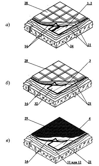 Рис. 11 Эксплуатируемые кровли а) - из «Элона-Супер»; б) - из «Элона-Супер Н»; в) - из «Кровлелона Е» на «Техноэласте» или «Элабите»