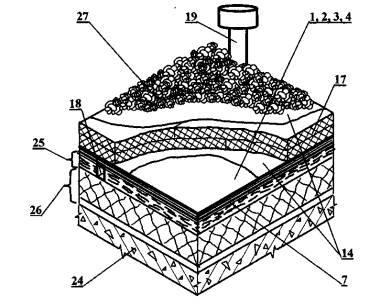 Рис. 12 Кровля с газоном (зеленая кровля) Инверсионная кровля На рисунке 13 показана схема инверсионной кровли (К-4-А), используемая в новом строительстве. Над цементно-песчаной стяжкой 21 собрана свободно лежащая водоизоляционная мембрана 1, 2, 3, 4 из «Элона-Супер», «Элона-Супер Н» или «Кровлелона Е». Сверху и снизу мембраны положены защитные слои 14 из геотекстиля. Выше - теплоизоляция 17, и, еще выше - гравий 27.