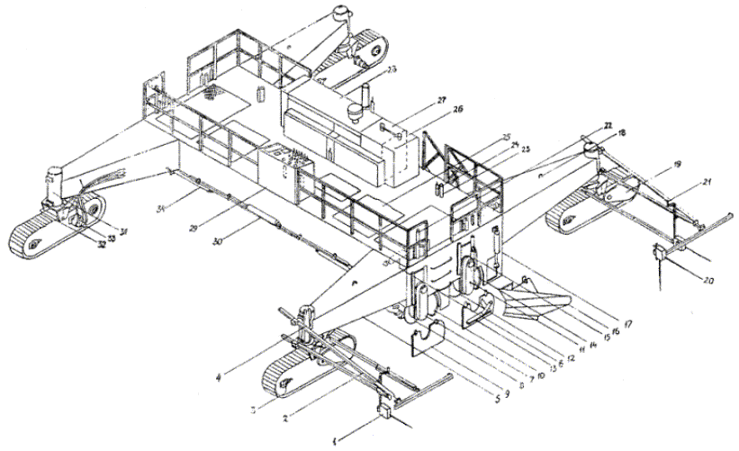 ОКОНЧАТЕЛЬНАЯ ПЛАНИРОВКА I. ОБЛАСТЬ ПРИМЕНЕНИЯТехнологическая карта предназначена для применения при разработке проекта производства работ, а также для организации работ и труда на объекте. Настоящая технологическая карта применяется при окончательной планировке грунтового основания профилировщиком Т5-425 или ДС-97 непосредственно перед устройством основания аэродромных покрытий. До начала работ по окончательной планировке грунтового основания должны быть выполнены все предшествующие работы в соответствии с требованиями «Указаний по производству и приемке аэродромно-строительных работ». СН 121-73, М., Стройиздат, 1974, и в том числе засыпка траншей водоотвода и инженерных сетей, а также работы по устройству временного водоотвода. Земляные работы в выемках выполняют с недобором грунта на 5 - 8 см, а в насыпях - с пересыпкой на 5 - 8 см. При этом грунт в насыпях должен быть послойно уплотнен. Для работы профилировщика в автоматическом режиме устанавливают копирную струну в соответствии с указаниями технологической карты «Установка копирных струн при устройстве оснований и покрытий аэродромов», М., Оргтрансстрой, 1976. Во всех случаях применения настоящей технологической карты должна быть проведена привязка ее к конкретным условиям производства работ. II. УКАЗАНИЯ ПО ТЕХНОЛОГИИ ПРОИЗВОДСТВЕННОГО ПРОЦЕССАКраткая техническая характеристика профилировщика Профилировщик TS-425 или ДС-97 (рис. 1) является универсальной автоматизированной машиной, предназначенной для планировки земляного полотна автомобильных дорог или грунтового основания аэродромов, распределения и планировки грунтов, укрепленных вяжущими при устройстве оснований, а также для чистовой планировки этих оснований. Техническая характеристика Габаритные размеры машины в рабочем положении, м: ширина............................................................................................... 8,53 - 10,06 длина.................................................................................................. 10,58 высота................................................................................................ 2,95 Ширина рамы в транспортном положении, м........................................ 3,05 Длина, м...................................................................................................... 8,74 Высота, м.................................................................................................... 1,62 База гусеничного хода, м........................................................................... 9,75 Ширина передней и задней колеи, м....................................................... 8,08 - 6,86 Вес машины, кг........................................................................................... 33069 в том числе: главная рама, кг............................................................................. 20385 четыре гусеницы и стойки ног, кг............................................... 12684 Дизельный двигатель мощностью, л.с..................................................... 425 Двигатель мощностью 425 л.с. приводит в движение 5 гидронасосов, которые создают давление рабочей жидкости в пяти гидросистемах, питающих энергией автономные гидромоторы гусениц и вращающихся рабочих органов, а также гидроцилиндры поворота гусениц, подъема главной рамы, подъема рабочих органов, погрузочных гидроцилиндров и др. Профилировщик оборудован автоматической системой выдерживания курса и стабилизации уровня. При работе на автоматическом режиме машина точно выдерживает направление и уровень, заданные копирной струной, установленной на одной стороне грунтового основания, так как профилировщик снабжен системой поперечной стабилизации уровня. Профилировщик имеет и ручное управлени
