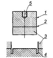 1 - металлическая пластинка; 2 - слой клея; 3 - слой затвердевшего раствора; 4 - основание; 5 - отверстие с внутренней резьбой по центру пластинки для крепления приспособления для отрыва образцов от основания Рисунок 6 - Разрушение на границе между слоем затвердевшего раствора и основанием (результат испытания соответствует прочности сцепления)