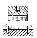 Рисунок 5 - Усеченное коническое кольцо Кольцевая фреза диаметром (50 ± 5) мм для изготовления образцов прорезанием кольцевого паза в затвердевшей смеси. Эпоксидная или метилметакриловая смола для приклеивания металлических пластинок к слою затвердевшей смеси или другой клей высокой прочности. Камера для выдерживания образцов, обеспечивающая твердение образцов при температуре (20 ± 2) °С и относительной влажности воздуха (60 ±10) %. Пресс с устройством для захвата приспособления для отрыва образца или другое средство испытания с индикатором с погрешностью измерения ± 5 % максимальной нагрузки. 7.1.2 Изготовление образцов для испытания 7.1.2.1 Образцы для испытания изготавливают в форме цилиндров диаметром 50 мм или призм с поперечным сечением в форме квадрата размером 50×50 мм. Толщина образцов должна быть не более 10 мм. 7.1.2.2 На основание устанавливают трафарет, на который наносят растворную смесь, подвижностью в соответствии с 6.2.1.3 или 6.2.2.3, приготовленную в соответствии с 6.2.1.2 или 6.2.2.2. Смесь заглаживают металлическим шпателем. По истечении времени, когда боковые стенки образцов сохраняют вертикальное положение, трафарет снимают. Образцы цилиндрической формы могут быть изготовлены без использования трафарета. Для изготовления образцов смесь, готовую к применению, наносят на основание слоем толщиной, рекомендованной предприятием-изготовителем, но не более 10 мм, и разглаживают. В период структурообразования (до начала схватывания) в слой смеси, вращая, вдавливают до основания усеченные конические кольца (см. рисунок 5). Затем, продолжая вращение, кольца осторожно удаляют. Если в процессе изготовления образца происходит нарушение формы образца или его сцепления с основанием, образец бракуют и изготавливают новый. Расстояние между кольцами, а также между кольцами и краями основания должно быть не менее 50 мм. Число образцов для испытания должно быть не менее пяти. 7.1.2.3 Изготовленные по 7.1.2.2 образцы до проведения испытания выдерживают в камере в течение 7 сут. при температуре (20 ± 2) °С и относительной влажности (60 + 10) %. В зависимости от области применения сухих смесей допускается твердение образцов по режиму, установленному в стандарте или технических условиях, по которым выпускают смесь конкретного вида. При проведении сертификационных и арбитражных испытаний образцы должны храниться по режиму, указанному выше. 7.1.2.4 Образцы размерами, указанными в 7.1.2.1, могут быть изготовлены из сплошного слоя раствора, затвердевшего на поверхности основания, прорезанием слоя любым режущим инструментом, например, кольцевой фрезой диаметром (50 ± 5) мм. Режим твердения свеженанесенного слоя растворной смеси - по 7.1.2.3. 7.1.3 Проведение испытания 7.1.3.1 Через 7 сут. к затвердевшим образцам приклеивают металлические пластинки с приспособлением для отрыва образцов и продолжают хранение образцов в камере при температуре (20 ± 2) °С и относительной влажности (60 ± 10) в течение 24 ч. При приклеивании необходимо следить, чтобы пластинки располагались строго по центру поверхности образцов, а клей не растекался по боковым поверхностям образцов. Силу отрыва образцов от основания определяют через 24 ч на прессе ил и другом средстве измерения при равномерной скорости нарастания нагрузки. Скорость нарастания нагрузки в зависимости от ожидаемого сопротивления отрыву (проч