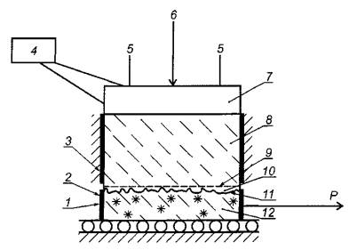 1- индикатор часового типа для измерений деформаций сдвига; 2 - подвижная обойма; 3 - неподвижная обойма; 4 - устройство для создания и регулирования температуры теплового штампа; 5 - индикаторы часового типа для измерения деформации осадки; 6 - вертикальная нагрузка; 7 - тепловой штамп; 8 - оттаявший грунт; 9 - плоскость среза; 10 - приконтактный слой (оттаивающий грунт); 11 - граница раздела оттаивающего и мерзлого грунта; 12 - мерзлый грунт; Р - сдвигающая нагрузка