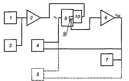 1 - генератор частоты; 2 - усилитель мощности; 3 - частотомер; 4 - измеритель отношения напряжений; 5 - осциллограф (необязательный элемент); 6 - согласующее устройство (усилитель заряда); 7 - измеритель коэффициента гармоник; 8 - вибростенд с катушкой возбуждения; 9 - калибруемый акселерометр; 10 - образцовый резистор; 11 - добавленный груз Рисунок 1 - Блок-схема испытательной установки для определения комплексной электрической проводимости Y Измерения проводят вначале без добавленного груза, а потом с добавленными грузами, устанавливаемыми на подвижный элемент. При этом комплексную электрическую проводимость, полученную при измерении без груза, обозначают Y0, а с использованием n-го груза - Yn. При измерении Ud важно, чтобы на клеммах заземления акселерометра и образцового резистора был одинаковый электрический потенциал. Измерения повторяют для всех амплитуд ускорения, используемых при калибровке. 8.2.2 Измерения для определения комплексного отношения напряжений (Uv при разомкнутых цепях В процессе данных измерений (см. рисунок 2) катушка возбуждения вибростенда работает как велосиметр. Значение комплексного отношения напряжений Uv рассчитывают по формуле Uv = ua2/uc, где иа2 - напряжение на разомкнутом выходе акселерометра; ис - напряжение на разомкнутом входе катушки возбуждения, когда в качестве источника вибрации, приводящего в движение подвижный элемент, использован вспомогательный вибровозбудитель или вторичная катушка возбуждения вибростенда. Измерения проводят без добавленных грузов. При измерении Uv важно, чтобы на клеммах заземления акселерометра и катушки возбуждения вибростенда был одинаковый электрический потенциал.