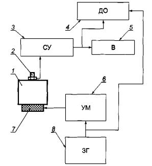 1 - вибропреобразователь; 2 - вольтметр; 3 - нагрузочный резистор; 4 - миллиамперметр; 5 - блок питания (БП) Рисунок 1 - Обобщенная схема для определения начального рабочего напраяжения (тока) вибропреобразователей с выходом по напряжению (току) 10.10.2 Устанавливают и подают на вибропреобразователь указанное в паспорте напряжение питания и измеряют значение начального рабочего тока Iсм и начального рабочего напряжения UCM на выходе вибропреобразователя. 10.10.3 Значение начального рабочего напряжения (тока) вибропреобразователей должно соответствовать значению, указанному в паспорте вибропреобразователя 10.11 Определение действительного значения коэффициента преобразования вибропреобразователя10.11.1 Поверяемый вибропреобразователь устанавливают на вибростол таким образом, чтобы направление главной оси чувствительности вибропреобразователя совпадало с направлением колебаний вибростола. Поверяемый вибропреобразователь закрепляют на вибростоле поверочной виброустановки в соответствии с требованиями, установленными в руководстве по эксплуатации (для пьезоэлектрических вибропреобразователей должны быть выполнены требования ГОСТ ИСО 5348). Для индукционных и пьезоэлектрических вибропреобразователей предпочтительно крепление с помощью резьбовых соединений (шпилька, крепление фланца вибропреобразователя с помощью болтов), для вихретоковых - с помощью специального кронштейна для закрепления над вибростолом вибровозбудителя (см. 10.4.2). 10.11.2 В соответствии с руководством по эксплуатации подключают вибропреобразователь соединительным кабелем к вторичным приборам. Включают и прогревают вторичные приборы, а также измерительные и технические средства поверочной виброустановки. Выход пьезоэлектрического вибропреобразователя без встроенных согласующих электронных устройств подключают соединительным кабелем к входу согласующего усилителя, выход последнего - к входу вольтметра. Пьезоэлектрический вибропреобразователь с выходом по напряжению подключают непосредственно к вольтметру, с выходом по току - к миллиамперметру. Индукционный вибропреобразователь подсоединяют непосредственно к вольтметру. Вихретоковый вибропреобразователь подсоединяют к вольтметру через устройство преобразования (драйвер). Вибропреобразователь с выходом по току подключают к вольтметру по схеме, приведенной на рисунке 1. В зависимости от типа вибропреобразователя на вибростоле поверочной виброустановки задают действительное значение физической величины: - для пьезоэлектрического вибропреобразователя - виброускорение ад с амплитудой не менее 10 м/с2 на частоте от 20 до 1000 Гц (предпочтительна базовая частота, указанная в паспорте вибропреобразователя); - для индукционного вибропреобразователя - виброскорость Vд с амплитудой не менее 10 мм/с на базовой частоте от 5 до 200 Гц; - для вихретокового вибропреобразователя в динамическом режиме - виброперемещение Sд с амплитудой не менее 50 мкм на базовой частоте от 20 до 160 Гц. 10.11.3 Считывают показания вольтметра. Рекомендуется при определении коэффициента преобразования на каждой частоте при использовании поверочной виброустановки с неавтоматизированной обработкой информации проводить не менее трех измерений, автоматизированной установки - не менее 12, среднее арифметическое значение результатов и