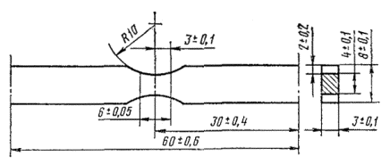 Погрешность регулирования температур не должна превышать 1 %, скоростей нагрева и охлаждения - 5 %. При нагреве и охлаждении испытываемого образца деформации растяжения (сжатия) не должны превышать 2 %, прогиб - 0,01 мм, угол закручивания - 1; равномерный нагрев среднего участка образца. Разница в температурах на этом участке не должна превышать 2 % от самой высокой в данный момент времени; поддержание температуры на границах рабочей части образца в течение всего процесса испытания не выше 50 °С; непрерывное измерение и запись температуры середины рабочей части образца, времени нагрева и охлаждения. Погрешность измерения и записи не должна превышать 0,5 %; защиту образца от окисления способом, не оказывающим влияния на свойства испытываемого материала. Структурная схема установки для имитации теплового воздействия сварки приведена в рекомендуемом приложении 2. 2.2. Остальная аппаратура, материалы и реактивы должны соответствовать: для испытаний на статическое растяжение - ГОСТ 1497-73 или ГОСТ 11150-75, или ГОСТ 9651-73; для испытаний на длительную прочность - ГОСТ 10145-62; для испытаний на ударный изгиб - ГОСТ 9454-78; для измерения твердости - ГОСТ 2999-75 или ГОСТ 9013-59; для выявления и определения величины зерна - ГОСТ 5639-65; для определения содержания структурных составляющих - ГОСТ 8233-56. 3. ПРОВЕДЕНИЕ ИСПЫТАНИЙ3.1. Испытаниям следует подвергать образцы по черт. 1. Количество образцов должно быть: для определения временного сопротивления, относительного удлинения после разрыва, относительного сужения после разрыва - не менее трех; для определения предела длительной прочности - не менее трех; для определения ударной вязкости - не менее трех; для измерения твердости - один и более; для выявления и определения величины зерна - один и более; для определения содержания структурных составляющих - один и более. Для определения временного сопротивления, относительного удлинения после разрыва и относительного сужения после разрыва разрешается применять образцы по черт. 3. 3.2. Испытываемые образцы следует нагреть и охладить в установке для имитации теплового воздействия сварки по следующим термическим циклам околошовной зоны: наибольшая температура нагрева должна быть равна 0,9 ± 0,02 температуры солидуса, средняя в интервале 700 - 900 °С скорость нагрева 250 ± 12,5 °С/с, средняя в интервале 600 - 500 °С скорость охлаждения - 0,1 ± 0,01; 1,0 ± 0,1; 10 ± 1,0; 100 ± 10 и 600 ± 60 °С/с. Разрешается проводить дополнительные испытания при других скоростях нагрева и охлаждения. 3.3. Для определения временного сопротивления, относительного удлинения после разрыва и относительного сужения после разрыва образцы по черт. 2 или типа I по ГОСТ 6996-66 следует испытывать по ГОСТ 1497-73 или по ГОСТ 11150-65, или по ГОСТ 9551-61. 3.4. Для определения предела длительной прочности образцы по черт. 2 следует испытывать по ГОСТ 10145-62. 3.5. Для определения ударной вязкости образцы типа VIII или XI по ГОСТ 6996-66 следует испытать по ГОСТ 9454-78. 3.6. Твердость, величину зерна и содержание структурных составляющих следует определять на среднем участке образцов по черт. 1. Твердость следует определять по ГОСТ 2999-75 или ГОСТ 9013-59, величину зерна - по ГОСТ 5639-65, содержание структурных составляющих - по ГОСТ 8233-56. 4. ОБРАБОТКА РЕЗУЛЬТАТОВ4.1. Вычисления значений следует производить: временного сопротивления, относительного удлинения после разрыва, относительн