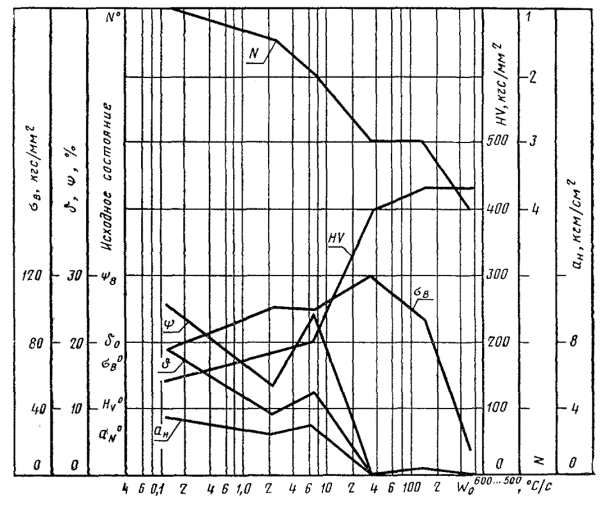 ПРИЛОЖЕНИЕ 3Рекомендуемое График зависимости временного сопротивления (σв), относительного удлинения после разрыва (δ), относительного сужения после разрыва (φ), твердости (НV), ударной вязкости (aн) и балла зерна (N0) при комнатной температуре от скорости охлаждения для стали 35