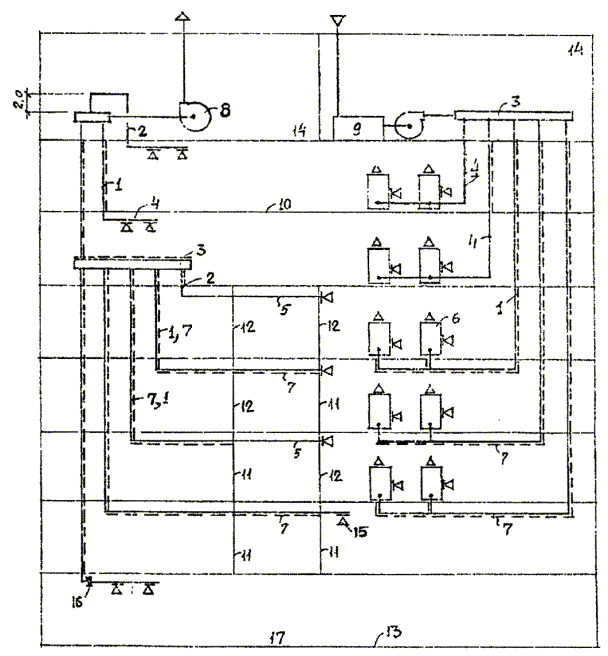 Рис. 2. Схемы воздуховодов с горизонтальными коллекторами. Защита от проникания дыма при пожаре из помещений одного этажа в помещения других этажей предусмотрена воздушными затворами 1 - воздушный затвор; 2 - воздушный затвор при присоединении сборного воздуховода первого этажа – вертикальная длина его до присоединения к коллектору должна быть не менее 2 м; 3 - горизонтальный коллектор; 4 - воздуховод в пределах обслуживаемого помещения; 5 - воздуховод вне пределов обслуживаемого помещения; 6 - эжекционный доводчик; 7 - транзитный воздуховод по п. 4.118; 8 - вытяжное вентоборудование; 9 - приточное вентоборудование; 10 - междуэтажное перекрытие; 11 - противопожарная стена или перегородка с нормируемым пределом огнестойкости по п. 3.1 СНиП 2.01.02-85*; 12 - стена или перегородка с ненормируемым пределом огнестойкости; 13 - пол; 14 - помещение для вентиляционного оборудования; 15 - воздухоприемное оборудование; 16 - огнезадерживающий клапан по п. 4.123; 17 - группа «присоединяемых» помещений общей площадью более 200 кв. м. другого назначения.