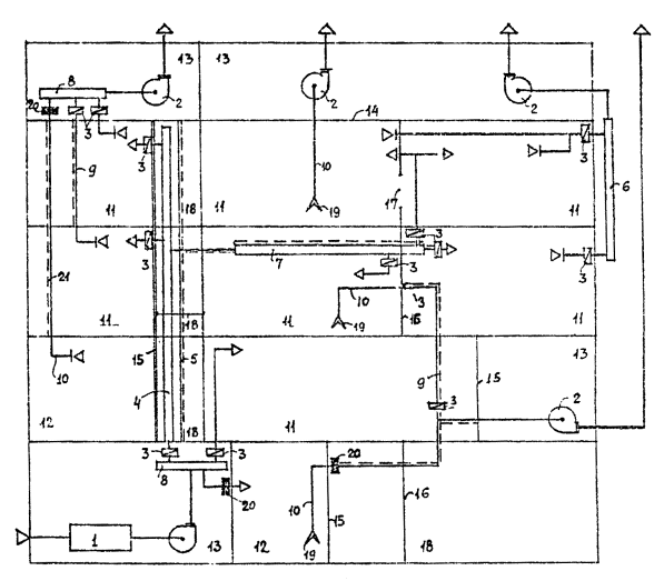 Рис. 4. Схемы воздуховодов для помещений категории А, Б или В. Защита от проникания дыма при пожаре из помещений одного этажа в помещения других этажей предусмотрена самозакрывающимися клапанами. 1 - оборудование приточкой системы; 2 - оборудование вытяжных систем; 3 - обратный клапан по п. 4.109 д для помещений категорий А и Б в исполнении по п. 4.74, для помещений категория В в обычном исполнении; 4 - вертикальный коллектор в шахте; 5 -шахта с нормируемым пределом огнестойкости 0,5 часа по п. 4.120 б; 6 - вертикальный коллектор снаружи здания по п. 4.121; 7 - горизонтальный коллектор с нормируемым пределом огнестойкости по п. 4.118; 8 - горизонтальный коллектор с нормируемым пределом огнестойкости по п.4.121; 9 - транзитный воздуховод с нормируемым пределом огнестойкости по п. 4.118; 10 - воздуховод в обслуживаемом им помещении по пп. 4.113 - 4.116; 11 - помещение категории А, Б или В; 12 - помещение других категорий или назначений площадью не более 200 м2; 13 - помещение для вентиляционного оборудования; 14 - перекрытие; 15 - противопожарная стена или перегородка с нормируемым пределом огнестойкости по п. 3.1 СНиП 2.01.02-85*; 16 - стена или перегородка с ненормируемым пределом огнестойкости или имеющая проем в другое помещение площадью 1 м2 и более; 17 - проем; 18 - коридор, холл или технический этаж; 19 - местный отсос взрывоопасной смеси; 20 - огнезадерживающий клапан, закрывающийся при пожаре; 21 - транзитный воздуховод из помещения 12 другого назначения площадью не более 200 м2; присоединяется к системе через огнеудерживающий клапан 20, в соответствии с требованиями п. 4.26 в СНиП.
