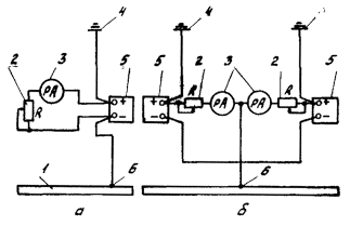 Рис. 32. Схема включения приборов и устройств при испытании преобразователей катодной защиты в режиме максимальной нагрузки: а - при работе одного преобразователя на один очаг анодного заземления; б - при работе двух преобразователей на два очага анодного заземления; 1 - трубопровод; 2 - регулируемый добавочный резистор нагрузки; 3 - амперметр; 4 - анодное заземление; 5 - преобразователь катодной защиты; 6 - точка дренажа 4.14. Во время минимальных токовых нагрузок тяговой сети железной дороги и при отключенных средствах и установках электрохимической защиты (в том числе и электродренажной установки на рассматриваемом участке трубопровода) измеряют разность потенциалов «труба-земля» и разность потенциалов «труба-рельс». Измерение следует выполнять в соответствии с п. 4.12, в и рис. 33 настоящих ВСН.