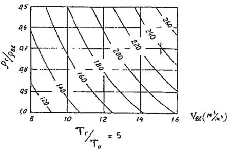 На рис. 4-5 изображены номограммы для определения длины факела (Lф), отнесенной к диаметру устья факельной установки (d), в зависимости от ТГ/То, VВВ и rВВ/rГ для четырех фиксированных значений TГ/То при диапазонах варьирования VВВ от 8 до 16 и rВВ/Рг от 0.5 до 1.0.