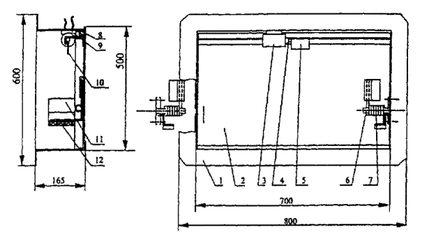 1 - корпус клапана; 2 - заслонка; 3 - электромагнит; 4 - сердечник электромагнита; 5 - регулируемая скоба; 6 - ось поворота заслонки; 7 - пружина; 8 - уплотнитель; 9 - концевой выключатель; 10 - штырь; 11 - кронштейн; 12 - резиновый амортизатор В миллиметрах