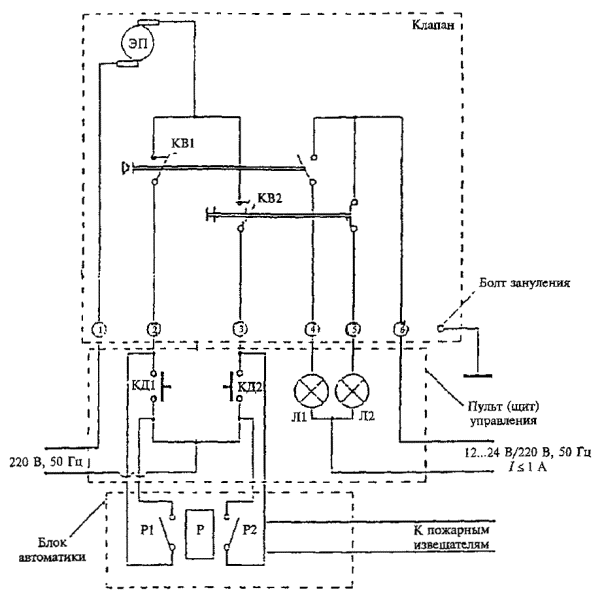 ЭМП - электромагнитный привод; ЭМ - электромагнит; КВ - концевой выключатель; Л1, Л2 - лампы световой сигнализации; Т - тумблер включения/выключения электропитания; РВ, КРВ - реле времени, контакт реле времени; ППК - прибор приемно-контрольный Электрическая схема подключения клапана КДМ-2 с приводом «Веlimо»