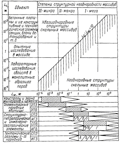 где dЭПБ - линейный размер ЭПБ, м; D - заданная точность определения среднего значения E0, %. Например, при D = 10 % значение D > 11dЭПБ, т.е. линейные размеры области опробования и ЭПБ различаются приблизительно на порядок. Индивидуального учета при расчетах устойчивости береговых примыканий плотин, деформируемости и прочности системы плотина - основание и т.д. требуют структурно-петрологические зоны тектонического происхождения (разломы II - IV порядков, особенно сейсмогенные), а также крупные трещины V порядка. При этом первостепенное значение имеет учет ориентации плоскости сместителя разрывного нарушения относительно оси водоподпорного сооружения, а также плоскости склона при оценке устойчивости береговых примыканий и т.д. Рис. 3. Форма связи блоков в массиве (а) и классификация их форм (б) (по Л. Мюллеру [42] с дополнениями). 3. КВАЗИОДНОРОДНЫЕ ОБЪЕМНЫЕ ЭЛЕМЕНТЫ СКАЛЬНЫХ МАССИВОВ3.1. Если некоторый объем массива Vм включает в себя ряд элементов неоднородности, объем Vн каждой из которых много меньше, чем Vм, то последний можно считать квазиоднородным по одному или нескольким признакам. Например, монопородный одновозрастный массив одного генезиса и единого строения без крупных структурных нарушений, находящийся в одном состоянии (по степени выветрелости, напряженному состоянию и заполнителю трещин), может целиком рассматриваться как квазиоднородный (если Vм >> Vн). Очевидно, что такое сочетание мало вероятно. Наличие в массиве разновозрастных пород различного состава, строения, состояния при всевозможных сочетаниях приводит к необходимости расчленения массива на множество квазиоднородных элементов с объемами Vм1, Vм2, …, Vмn (при прежнем условии: Vмi >> Vн). 3.2. В основе выделения контуров квазиоднородных элементов массива на ГСМ лежат следующие принципы: - контуры квазиоднородных элементов должны совпадать с основными геологическими границами: стратиграфическими, литолого-петрологическими и тектоническими контактами; - контуры квазиоднородных элементов должны совпадать с границами подзон А, Б, В, Г различной степени выветривания и разгрузки естественного напряженного состояния массива; - контуры квазиоднородных элементов должны совпадать с резкими температурно-влажностными границами раздела: а) сухих пород в зоне аэрации; б) водонасыщенных пород ниже уровня подземных вод; - контуры квазиоднородных элементов и размеры последних должны учитывать площади конструктивных и технологических элементов проектируемого сооружения. Применительно к секции крупной бетонной плотины это означает (см. п. 1.6), что квазиоднородный элемент с максимальным (из трех) линейным размером менее 10 м может не выделяться, а значит может быть объединен с соседними. 3.3. В процессе инженерно-геологических изысканий рекомендуется производить постадийно уточняемое районирование изучаемой территории, выделение границ квазиоднородных элементов-блоков и зон последовательно уменьшающегося объема, а именно: структурно-тектонических, структурно-петрологических и инженерно-геологических. Границами СТБ будут служить плоскости СТЗ, представляющие собой глубинные разломы II - I порядков, значительная часть которых может оказаться сейсмогенной с повышенной вероятностью проявления современных дифференциальных тектонических движений, вызывающих землетрясения и соп