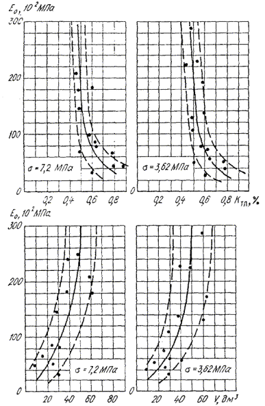 соотношения длин сторон ЭПБ, В сводную таблицу рекомендуется помещать результаты статистической обработки характеристик: средние значения и пределы изменения (при вероятности 5 и 95 % на кумулятивных кривых). Физико-механические свойства пород (в образце, в массиве) Соответствующие графы этих разделов содержат информацию о средних и предельных значениях характеристик: а) для образцов пород: Кр, dмин, d, n, W, vp, Rсж, Ед, tgj, С; б) для массива: Е0, Ед, vр, q, tgj, С. Перечисленные характеристики (образцов и массива) желательно получить раздельно для пород подзон Б, В, Г. Прогнозная оценка свойств скальных пород в массивеПрогнозная оценка деформационных, прочностных и фильтрационных характеристик базируется на использовании аналогов, а также корреляционных связей показателей трещиноватости, блочности, скорости упругих волн, относительного электрического сопротивления между собой, а также с характеристиками свойств. При подборе природного аналога необходимо помнить, что между ним и изучаемым объектом должно быть установлено геологическое подобие на основе рассмотрения основных факторов: Рис. 4-3. Расчетная зависимость объема блоков горных пород V от коэффициента трещинной пустотности Ктп 1 - для кубической формы блоков; 2 - для призматической формы блоков; 3 - для пластинчатой формы блоков; исходный объем породы равен 1 м3; раскрытие трещин 1 мм. - генетического типа породы и ее минерального состава; - геологической истории района; - состояния породы; - условий залегания пород (ориентировка элементов залегания и основных систем трещин относительно долины реки или направления сил, передаваемых на основание сооружением); Рис. 4-4. Связи модуля деформации Е0 со средним объемом ЭПБ V и Ктп для известняков эоцена в Тунисе по данным полевых опытов при первом цикле нагружения. - характера современного рельефа и геоморфологических особенностей. Различные корреляционные связи характеристик состояния и свойств показаны на рис. 4-3 - 4-10. Рис. 4-3 иллюстрирует зависимость среднего объема ЭПБ от Ктп. На рис. 4-4 показаны связи статического модуля деформации со средним объемом ЭПБ и значением Ктп в известняках основания Кассебского гидроузла. На рис. 4-5 показано влияние различного сочетания пластов разной мощности (от 0,4 до 5,0 м), типов ритмов, удельного содержания маломощных пластов в пачках известняков основания Ингурской ГЭС на величину удельного водопоглощения q. Основание характеризовалось шестью типами ритмов с преобладанием соответственно пластов мощностью: Н1 (первый тип) < 0,4 м; Н2 = 0,44 ¸ 1,0 м; Н3 = 0,4 ¸ 1,0 м и Н3 = 1,0 ¸ 2,0 м; Н4 = 1,0 ¸ 2,0 м; Н5 = 0,4 ¸ 1,0 м и Н5 = 2,0 ¸ 3,0 м; Н6 ³ 2,0 ¸ 3,0 м. Рис. 4-5. Связь водопроницаемости q известняков основания Ингури ГЭС с характеристиками их состава и строения а - с содержанием маломощных пластов известняка, %, в ритмичной толще; б - со средней мощностью пластов ритма (0 - 2,0 м); в - с типами ритмов (I - VI); г - распределение значений q; 1 - тектонические нарушения; 2 - мелкие трещины и тектонические нарушения; 3 - мелкие трещины в массиве вне тектонических зон. Резко повышенная водопроницаемость зон тектонических нарушений в скальных массивах, в частности известняках, выявляется путем построения графиков связи удельного водопоглощения q и заглубления в массив по вертикали h (рис. 4-6). По характеру кривых в верхней части разреза скального массива можно судить о м