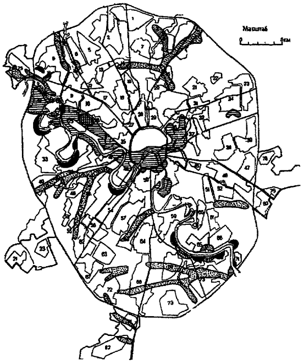 Рис. 21. Схема палеодолин на территории Москвы. Смоленско-Московская моренно-эрозионная возвышенность расположена на севере и северо-западе Москвы. В рельефе данной области прежде всего выделяется пологоволнистая моренная равнина, слаборасчлененная с абсолютными отметками от 165 до 185 м с глубиной расчленения от 5 до 15 м/км2 [8, 17]. Геологическое строение области более разнообразно, чем нa юго-западе Москвы. В связи со значительным размывом мезозойских отложений, каменноугольные карбонатные породы залегают на глубине от 30 до 80 м от поверхности. Перекрывающие их мезозойские отложения представлены большей частью юрской песчано-глинистой толщей. Отложения нижнего мела сохранились лишь местами. Верхневолжские песчанистые глины, сильно увлажненные, обладают тиксотропными свойствами и при механическом воздействии способны переходить в подвижное состояние, что следует учитывать при освоении подземного пространства. Четвертичные отложения залегают в основном на нижнемеловых или верхневолжских песках. Разрез представлен переслаиванием различных по возрасту флювиогляциальных песков и моренных суглинков общей мощностью от 12 до 30 м. В южной части области, давно освоенная территория покрыта техногенными образованиями, мощность которых обычно составляет от 2-4 до 8 м. По своему составу техногенные отложения, как правило, неоднородны и очень разнообразны. Они содержат строительный и бытовой мусор, отходы производства, перекопанные четвертичные коренные породы, остатки кирпичных фундаментов и т.д. Водоносный комплекс мезокайнозойских отложений данной области представлен горизонтами, заключенными в четвертичных, нижнемеловых и юрских песчаных отложениях, которые гидравлически связаны между собой. Уровень грунтовых вод располагается на глубине 3-5 м. Повсеместное распространение в северной части покровных суглинков, а в южной части техногенных отложений привело к образованию верховодки. Третья область - Мещерская зандровая низменная равнина расположена на северо-восточной окраине Москвы. По характеру рельефа область представляет собой слаборасчлененную равнину среднечетвертичного возраста с редкими моренными останцами и абсолютными отметками поверхности 150-165 м. Равнина имеет слабую расчлененность и плоский рельеф, почти половина ее площади не имеет ложбин стока. Четвертичные отложения в этой области имеют мощность 10-30 м и в основном залегают на маломощных (5-6 м) нижнемеловых и верхнеюрских песках. Общая мощность мезозойских отложений составляет 40 м. Верхняя часть четвертичного разреза почти повсеместно сложена флювиогляциальными песками и моренными суглинками. Характерной особенностью области является отсутствие покровных суглинков. Гидрогеологические условия этой области определяются наличием гидравлической связи всех водоносных горизонтов мезокайнозойского комплекса. Глубина залегания грунтовых вод колеблется от 2 до 5, реже до 10 м, имеются также территории с глубиной залегания грунтовых вод менее 2 м. Четвертая инженерно-геологическая область рассматривается как область унаследованного развития речных долин, совпадает с границами современной долины рек Москвы и Яузы и занимает большую часть территории города, пересекая ее с северо-запада на юго-восток. Долина р. Москвы имеет асимметричное строение с пре