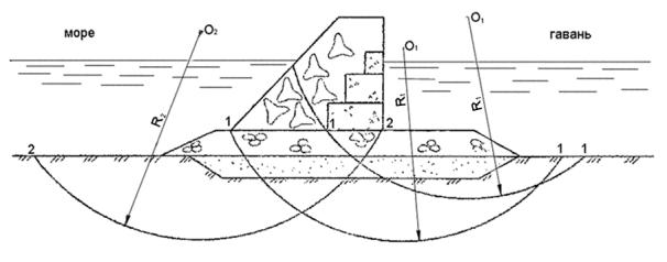 где aR - расстояние от края основания экрана до точки приложения равнодействующей; t3 - толщина каменной постели. Рис. 7. Схема расчета общей устойчивости сооружения по круглоцилиндрическим поверхностям: 1 - 1 - поверхности сдвига в сторону гавани; 2 - 2 - поверхность сдвига в сторону моря Приведенные нормальные напряжения в точках А и B определяются по формулам: Для обеспечения надежной работы сооружения по условию прочности основания должно быть выполнено условие