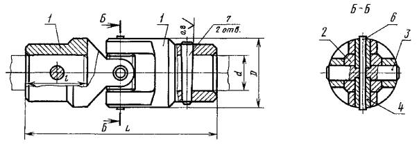 1 - полумуфта; 2 - крестовина; 3 - палец; 4 - втулка; 5 - спаренная вилка; 6 - штифт по ГОСТ 10774 (1 шт. для типа 1 и 2 шт. для типа 2, обозначение см. приложение Б); 7 - штифт по ГОСТ 3129 (2 шт., обозначение см. приложение Б) Рисунок 1 - Муфта шарнирная Таблица 1 Размеры в миллиметрах