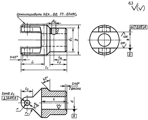 3 Постановлением Государственного комитета Российской Федерации по стандартизации и метрологии от 2 марта 2001 г. № 113-ст межгосударственный стандарт ГОСТ 5147-97 введен в действие непосредственно в качестве государственного стандарта Российской Федерации с 1 января 2002 г. 4 ВЗАМЕН ГОСТ 5147-80 ГОСТ 5147-97 МЕЖГОСУДАРСТВЕННЫЙ СТАНДАРТ МУФТЫ ШАРНИРНЫЕ Параметры, конструкция и размеры Joint couplings. Дата введения 2002-01-01 1 Область примененияНастоящий стандарт распространяется на малогабаритные шарнирные муфты общемашиностроительного применения, климатических исполнений У и Т, категорий 1 - 3, климатических исполнений УХЛ и О, категории 4 по ГОСТ 15150, предназначенные для соединения цилиндрических валов, которые устанавливают под углом до 45°, и передачи крутящего момента от 11,2 до 1120 Н . м без смягчения динамических нагрузок. Требования стандарта являются обязательными, кроме п. 3.5, рисунка А.4, таблицы А.4 и приложения Б. 2 Нормативные ссылкиВ настоящем стандарте использованы ссылки на следующие стандарты: ГОСТ 9.301-86 Единая система защиты от коррозии и старения. Покрытия металлические и неметаллические неорганические. Общие требования ГОСТ 9.303-84 Единая система защиты от коррозии и старения. Покрытия металлические и неметаллические неорганические. Общие требования к выбору ГОСТ 9.306-85 Единая система защиты от коррозии и старения. Покрытия металлические и неметаллические неорганические. Обозначения ГОСТ 3129-70 Штифты конические незакаленные. Технические условия ГОСТ 4543-71 Прокат из легированной конструкционной стали. Технические условия ГОСТ 8908-81 Основные нормы взаимозаменяемости. Нормальные углы и допуски углов ГОСТ 10774-80 Штифты цилиндрические заклепочные. Технические условия ГОСТ 15150-69 Машины, приборы и другие технические изделия. Исполнения для различных климатических районов. Категории, условия эксплуатации, хранения и транспортирования в части воздействия климатических факторов внешней среды ГОСТ 24643-81 Основные нормы взаимозаменяемости. Допуски формы и расположения поверхностей. Числовые значения 3 Параметры, конструкции и размеры3.1 Муфты должны изготовляться следующих типов: 1 - одинарные; 2 - сдвоенные с промежуточной спаренной вилкой. Полумуфты для муфт каждого типа должны изготовляться следующих исполнений: 1 - на длинные концы валов; 2 - на короткие концы валов. 3.2 Параметры: номинальный крутящий момент Мкр, динамический момент инерции Ми, масса, конструкция и размеры муфт должны соответствовать указанным на рисунке 1 и в таблице 1. 3.3 Конструкция и размеры деталей, входящих в муфту, должны соответствовать указанным в приложениях А и Б. 3.4 Пример условного обозначения шарнирной муфты, передающей номинальный крутящий момент Мкр = 140 Н . м, типа 1, диаметром посадочного отверстия полумуфт d = 20 мм, с полумуфтой, исполнения 1, климатического исполнения У, категории 3 по ГОСТ 15150: Муфта шарнирная 140-1-20-1-У3 ГОСТ 5147-97 То же, типа 2, с полумуфтами диаметром посадочного отверстия d = 19 мм, исполнения 1, диаметром d = 22 мм, исполнения 2, климатического исполнения Т, категории 2 по ГОСТ 15150: Муфта шарнирная 140-2-19-1-22-2-Т2 ГОСТ 5147-97 По заказу потребителя допускается уменьшать посадочное отверстие d в одной из полумуфт до значения, установленного в таблице 1 для других номинальных крутящих моментов. 3.6 Штифты - по ГОСТ 3129, твердость 35...49 HRCэ. 3.7 Допуски углов конусов отверстий