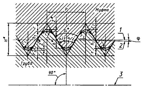 где s - номинальная толщина стенки, мм; D - номинальный наружный диаметр трубы, мм; R - допускаемое напряжение, кгс/мм2 (МПа), принимаемое равным 0,8 σт min. (Измененная редакция, Изм. № 2). 2.13. Основные параметры и размеры резьбовых соединений труб гладких и с высаженными наружу концами и муфт к ним 2.13.1. Форма и размеры профиля резьбы труб и муфт к ним должны соответствовать указанным на черт. 5 и в табл. 9. 2.13.2. Размеры резьбовых соединений гладких труб и муфт к ним должны соответствовать указанным на черт. 6 и в табл. 10, а труб с высаженными наружу концами и муфт к ним - на черт. 6 и в табл. 11. * Размеры для справок. 1 - линия, параллельная оси резьбы; 2 - линия среднего диаметра резьбы; 3 - ось резьбы Черт. 5 Таблица 9 Размеры, мм