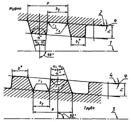 Примечания: 1. Шаг резьбы Р измеряют параллельно оси резьбы трубы и муфты. 2. Все предельные отклонения на элементы профиля резьбы за исключением предельных отклонений на углы наклона сторон и высоту профиля даны для проектирования резьбообразующего инструмента и контролю не подвергают. 3. Высота профиля наружной резьбы h1 труб НКБ обеспечивается на счет соответствующего положения гладкого и резьбовых калибров-колец и контролю не подвергают. 4. Допускается замена фасок с радиусом округления r = 0,2+0,05 мм (кроме наружной резьбы труб НКБ). * Размеры для справок. 1 - ось резьбы трубы НКМ и ниппельного конца трубы НКБ; 2 - линия, параллельная оси резьбы трубы НКМ и ниппельного конца трубы НКБ; 3 - ось резьбы муфты НКМ и раструбного конца трубы НКБ; 4 - линия, параллельная оси резьбы муфты НКМ и раструбного конца трубы НКБ Черт. 8 (Измененная редакция, Изм. № 3). 2.14.2. Размеры соединений должны соответствовать указанным на черт. 10 и в табл. 14 (для труб) и черт. 10 и в табл. 15 (для муфт). (Измененная редакция, Изм. № 2, 3). 2.14.3. Предельные отклонения от номинальных размеров резьбы должны соответствовать указанным в табл. 16. (Измененная редакция, Изм. № 3). 2.14.4. Предельные отклонения конусности на всей длине уплотнительного конического пояска труб и уплотнительной конической расточки муфт соответственно ±0,03 и +0,06 мм. 2.14.5. При определении натяга резьбы трубы измерительная плоскость калибров-колец должна находиться на расстоянии H от торца трубы (черт. 11): 20-1,2 мм - натяг по резьбовому калибру-кольцу с полным и неполным профилем (для труб условным диаметром от 60 до 102 мм); 20-2,4 мм - натяг по гладкому калибру-кольцу (для труб условным диаметром от 60 до 102 мм); 24-2,5 мм - натяг по гладкому и резьбовому калибрам-кольцам (для труб условным диаметром 114 мм). (Измененная редакция, Изм. № 3). * Размеры для справок. 1 - ось резьбы муфты; 2 - линия, параллельная оси резьбы муфты; 3 - ось резьбы трубы; 4 - линия, параллельная оси резьбы трубы Черт. 9 Соединения гладких высокогерметичных труб - НКМ Таблица 14 Размеры, мм