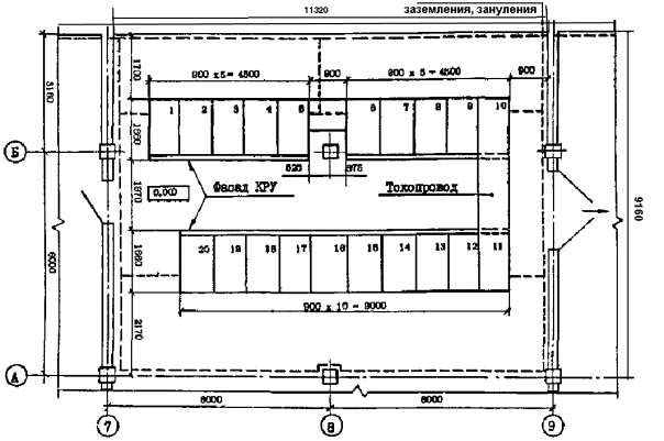 Рис. 31. Пример выполнения плана расположения шкафов КРУ, ошиновки и прокладки сети заземления в электротехническом помещенииРис. 32. Пример выполнения плана расположения кабельных трасс