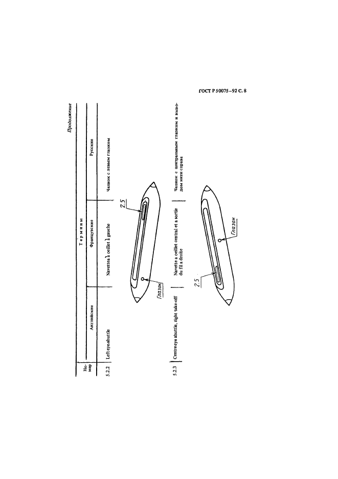 ГОСТ Р 50075-92Машины текстильные и оборудование вспомогательное. Челноки. Термины и обозначения в зависимости от положения глазка