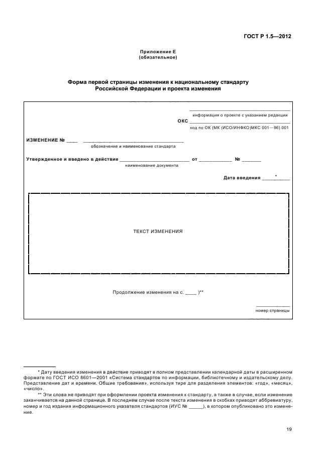| Название документа рус.: | Стандартизация в Российской Федерации. Стандарты национальные. Правила построения, изложения, оформления и обозначения | | Название документа англ.: | Standardization in Russian Federation. National Standards. Rules of structure, drafting, presentation and indication | | Дата актуализации текста: | 01.12.2013 | | Дата издания: | 19.08.2013 | | Дата введения: | 01.07.2013 | | Дата последнего изменения: | 11.09.2013 | | Область применения: | Настоящий стандарт устанавливает правила построения, изложения, оформления и обозначения национальных стандартов Российской Федерации и предварительных национальных стандартов, а также правила оформления и изложения изменений к национальным стандартам Российской Федерации.