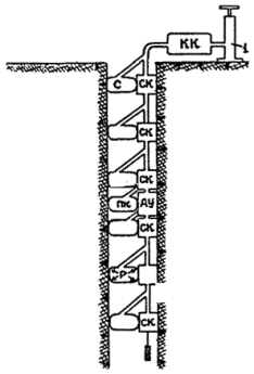 непрерывного АК получают диаграммы величин t1, Т2, DТ, А1, А2, Многоканальный АК с точечной регистрацией 5.43. Комплектной аппаратуры для выполнения многоканального АК отечественная промышленность не выпускает. Для проведения этого вида исследований используются ультразвуковые сейсмоскопы различных конструкций и скважинные зонды, изготовляемые силами геофизических организаций. 5.44. Наибольшее распространение получила установка многоканального каротажа Гидропроекта. Она состоит из ультразвукового сейсмоскопа, созданного на базе Р 5-5, снабженного фотоприставкой с аппаратом "Смена-8". На скважинном зонде через каждые 20 см размешены семь обратимых пьезопреобразователей с собственной частотой 70 кГц. Посредством экранированного кабеля РК-50-2 все семь ультразвуковых датчиков зонда непосредственно соединены со входом сейсмоскопа, где с помощью ручного переключателя они могут включаться как излучателями, так и приемниками ультразвука в любой комбинации. Многоканальная запись получается путем поканального фотографирования волновых картин с экрана сейсмоскопа при одновременном перемещении фотопленки. Для облегчения последующей обработки полученные фотопленки ФЭД печатаются с увеличением 5:1 на фотоувеличителе П-10. Минимальный диаметр изучаемых скважин 58 мм. 5.45. Оптимальная стандартная методика наблюдений заключается в регистрации встречных годографов от двух крайних датчиков, каждый из которых подключается в качестве излучателя, а остальные последовательно в качестве приемников. При перемещении зонда с шагом 1 м по всей длине скважины получается непрерывная система встречных годографов. На каждой фотоосциллограмме, соответствующей одной стоянке зонда, размещаются 12 записей ультразвуковых колебаний и марки времени. АК с точечной регистрацией волновых картин в сухих скважинах 5.46. В качестве измерительной аппаратуры для АК сухих скважин используются приборы типа ИПА-59, УКБ-1, УКБ-2, УК-10П, ДУК-20 и различные варианты переделанных для этих целей приборов ИКЛ-5, Р5-5 и т.д. 5.47. При АК используются различные виды зондов (в основном конструкции Гидропроекта), допускается изготовление зондов по аналогичным схемам. 5.48. Число пьезопреобразователей в зонде может быть различным, но не меньше трех. Расстояния между элементами зонда выбираются в зависимости от необходимой детальности исследования разреза. Как правило, оно составляет 10 или 20 см. 5.49. В сухих скважинах зонд прижимается к стенке скважины с помощью шарнирного или пневматического устройства. 5.50. Измерения при АК сухих скважин сводится к регистрации волновых картин на электронно-лучевой трубке прибора путем фотографирования или зарисовки с обязательным фиксированием масштабных марок времени. Параллельно с этим необходим визуальный отсчет времени прихода первых вступлений и характерных фаз. 5.51. При каждом заданном положении зонда применяются встречные системы наблюдений по общепринятой схеме использования преобразователей зонда (датчиков). Зонд перемещается вдоль скважины с шагом, обеспечивающим перекрытие двух крайних точек. Положение зонда, в скважине определяется по меткам на кабеле или специальном несущем тросе. АК выполняется при подъеме зонда. 5.52. В каротажном журнале регистрируются номер волнограммы, номер кадра, глубина погружения зонда, номер пьезопреоб
