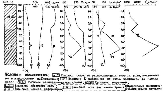 4.22. Для определения объемного веса грунтов следует производить погружение обсадных труб специального назначения (дюралюминиевых труб). При их отсутствии допускается использовать стальные трубы (буровые штанги). Материал, толщина стенок и диаметр труб должны обеспечить погружение их без образования перекосов и изгибов. Колонна труб должна быть оборудована снизу конусом, а места соединения изолированы от проникновения воды. Использование муфтовых и ниппельных соединений труб не допускается. В этом случае рекомендуется отменять цельносварные трубы. При определении плотности устойчивых грунтов допускается проводить измерения в необсаженных скважинах диаметром до 65 мм. Максимальные отклонения диаметра скважин от принятых при градуировке не должны превышать 2 мм. Нейтрон нейтронный каротаж (ИНК) 4.23. Нейтрон нейтронный каротаж при инженерно-геологических изысканиях в основном используется для определения объемной влажности грунтов (нейтронный метод определения объемной влажности). Для уточнения литологического состава разреза скважин ННК практически не применяется из-за искажающего влияния переменного диаметра скважины и толщины глинистой корки. 4.24. Для нейтронных определений влажности используются приборы (влагомеры) типа УР-70, ВПГР-1, РВГ-36 и т.п. В методе ННК используется способ регистрации медленных нейтронов. Чем выше влажность (водородосодержание) среды, тем больше медленных нейтронов образуется вблизи источника и тем меньше линейные размеры этого поля. Глубинность исследования зависит от влажности среды, уменьшаясь с увеличением последней. При изменении влажности пород от 5 до 30 % эффективный радиус исследования уменьшается от 30 до 15 см. На показания ННК существенное влияние оказывают переменный диаметр скважины, изменение плотности скелета грунта, материал и толщина обсадной трубы, хим. состав грунта и другие факторы. Изменение толщины стенки стальных труб на 3 мм вызывает погрешность в определении влажности на 2 - 3 % в диапазоне объемной влажности 10 - 20 %, и на 8 - 12 % в диапазоне 30 - 50 %. В то же время аналогичное изменение толщины стенки дюралюминиевых труб в тех же диапазонах повлечет за собой погрешность соответственно в 1 - 1,5 и 3 - 4 % (прил. 12). 4.25. Градуировка нейтронных влагомеров проводится на основе сопоставлений показаний приборов и определения влажности грунтов термостатно-весовым методом по ГОСТ 5180-75 в пункте измерения. Градуировку влагомера следует осуществлять не менее чем для пяти значений объемной влажности в интервале 2 - 7, 7 - 15, 15 - 25, 25 - 35, 35 - 45 %. Градуировка нейтронных влагомеров проводится в трубах-имитаторах, материал и типоразмеры которых соответствуют трубам при полевых измерениях. 4.26. В местах проведения градуировки прибора грунт должен быть однородным в пределах объема, с которого снимается информация. Для грунта с объемной влажностью в диапазоне 2 - 10 % размеры эталонных сред должны быть не менее 1´1´1 м; для грунтов с большими значениями объемной влажности размеры должны быть не менее 0,8´0,8´0,8 м. Подробная методика градуировки влагомера изложена в руководстве [14]. 5. МЕТОДИКА И ТЕХНИКА ПРОВЕДЕНИЯ СЕЙСМОАКУСТИЧЕСКОГО КАРОТАЖА И ВЕРТИКАЛЬНОГО СЕЙСМИЧЕСКОГО ПРОФИЛИРОВАНИЯСейсмокаротаж (СК). 5.1. Сейсмокаротаж (СК) и вертикальное сейсмическое профилирование (ВСП) инженерно-геологических скважин 