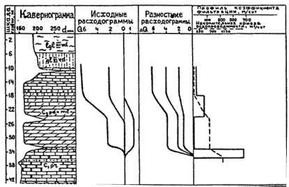 По величинам пэф определяют далее значение потока Qп , прошедшего через прибор, в которое и вводится поправка на диаметр Кd. 11.26. При интерпретации расходограмм следует учитывать все геолого-геофизические данные. Разрез расчленяется на водоупорные и водопроницаемые пласты, определяется глубина их залегания, мощность и структура. 11.27. При обработке данных