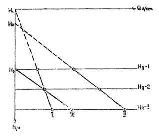 где К - количество пластов, каждый с соответствующей скоростью и мощностью. Рассчитанный годограф сопоставляется при необходимости с вертикальным годографом, построенным по данным обращенного сейсмокаротажа. Для построения по скважинам амплитудных графиков используют обычно амплитуду продольной волны на среднем датчике, погрешность определения амплитуд должна быть не более ± 10 - 15 %. 11.21. Обработка данных расходометрии должна включать следующее: построение предварительного графика изменения скорости вращения крыльчатки прибора от глубины точки наблюдения f (h) = п; построение кавернограммы и совмещение ее с графиком п = f (h) для уточнения мест детализационных измерений; определение переходного коэффициента Кd расхода воды за диаметр скважины (каверны) для каждой точки наблюдения (прил. 20); определение расхода потока, прошедшего через прибор, по тарировочному графику п = f (Q); вычисление расхода потока через сечение ствола скважины в каждой точке наблюдения по формуле Qскв = Qпр ´ Kd; построение расходограммы в виде графика Qскв = f (п). Вертикальный масштаб расходограммы должен соответствовать масштабу построения инженерно-геологической колонки скважины; горизонтальный масштаб выбирается таким, чтобы отклонения точек вследствие 5 – 10 % погрешности измерений укладывались в 1 - 2-мм отрезке горизонтальной оси. При построении расходограммы необходимо учитывать смещение точек замера на детину водоканала прибора. 11.22. Расходограммы, снятые на различных ступенях динамического режима скважины, должны совмещаться в единых координатных осях, масштаб расхода допускается выбирать произвольно с учетом точности наблюдения. 11.23. Для определения статического уровня и его понижения (повышения) для каждого водоносного пласта необходимо использовать гидродинамический метод, заключающийся в измерении дебитов Q в зависимости от уровня воды в скважине Hg и построении затем графиков зависимости Q от Hg (прил. 23). 11.24. В интервалах, где отсутствует стабилизация измеряемого потока, необходимо с помощью графиков п = f (h) рассчитать величину С