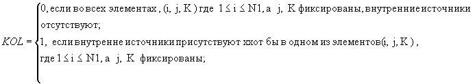 номер типа источника, MD - номер зоны краевых условий верхней границы, в которой находится элемент (i, j, K) области исследования; MDK - номер зоны краевых условий нижней границы для соответствующего элемента (N i, j, K) области исследования. Для двухмерной задачи табл. 3 состоит из одного столбца для K = 1, для одномерной из одного числа KL (1,1).
