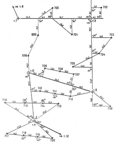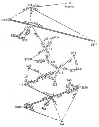 Съемочная плановая геодезическая сеть в виде теодолитных ходов (магистралей) или заменяющей их триангуляции строится в развитие опорной геодезической сети в соответствии о требованиями пп. 2.101-2.115 СНиП 1.02.07-87. На участках изысканий до 1 км2 съемочная геодезическая сеть может служить самостоятельной геодезической основой.