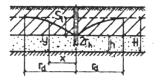 где у - остаточный напор, отсчитываемый от кровли разделяющего слоя водоупорных пород, м; hd - толщина не нарушаемого при разработке разделяющего слоя водоупорных пород, м. При этом остается в силе требование понижения уровня подземных вод в толще пород, где располагаются подземные горные выработки, ниже их подошвы. При невозможности понижения уровня подземных вод ниже подошвы горных выработок с помощью внешахтных водопонизительных устройств допускается при соответствующем обосновании использовать их для практически достижимого водопонижения, предусматривая в пределах шахтного поля устройства и мероприятия согласно п. 1.15. 2.5. Необходимое время для достижения требуемого понижения уровня подземных вод, распространение депрессии и развитие водопонизительной системы должны определяться соответственно схеме горных работ. 2.6. Схематизация природных условий для расчета водопонижения должна отражать действительные гидрогеологические условия, геологическое строение толщи и характеристики слагающих ее слоев. 2.7. Расчет водопонижения, как правило, следует выполнять исходя из линейного закона фильтрации, выражаемого формулой