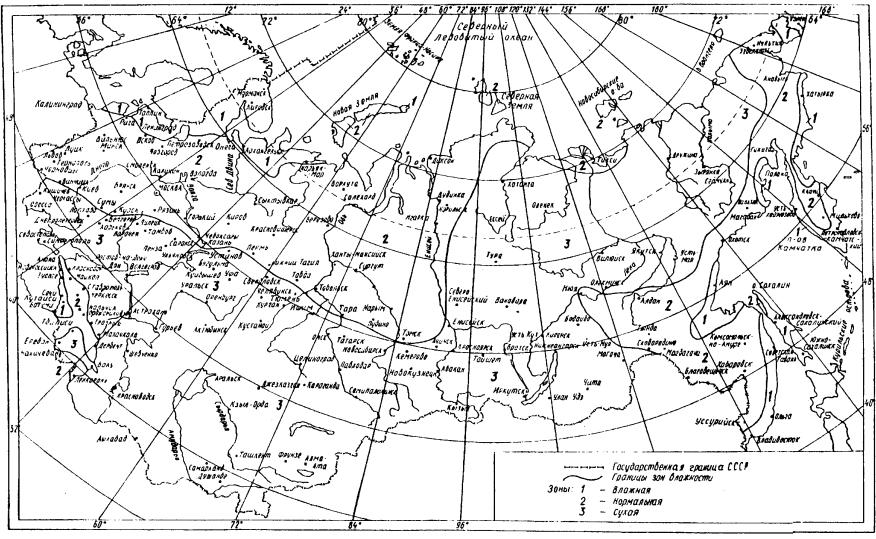 1.3. Влажностный режим помещений зданий и сооружений в зимний период в зависимости от относительной влажности и температуры внутреннего воздуха следует устанавливать по табл. 1. Зоны влажности территории СССР следует принимать по прил. 1*. Условия эксплуатации ограждающих конструкций в зависимости от влажностного режима помещений и зон влажности района строительства следует устанавливать по прил. 2. Таблица 1