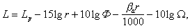 4.5. Октавные уровни звукового давления L в дБ в расчетных точках, если источник шума и расчетные точки расположены на территории жилой застройки или на площадке предприятия, следует определить по формуле где Lр - октавный уровень звуковой мощности в дБ источника шума; Ф - то же, что в формулах (1) и (2); r - расстояние в м от источника шума до расчетной точки; W - пространственный угол излучения звука, принимаемый для источников шума, расположенных: в пространстве - W = 4p; на поверхности территории или ограждающих конструкций зданий и сооружений - W = 2p; в двухгранном углу, образованном ограждающими конструкциями зданий и сооружений, - W = p; bа - затухание звука в атмосфере в дБ/км, принимаемое по табл. 6. Примечания: 1. Октавные уровни звукового давления L в дБ допускается определять по формуле (7), если расчетные точки расположены на расстояниях r в м, больших удвоенного максимального размера источника шума. 2. При расстояниях r £ 50 м затухание звука в атмосфере в расчетах не учитывается. Таблица 6