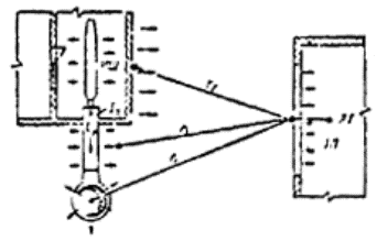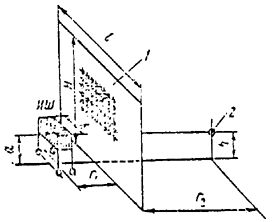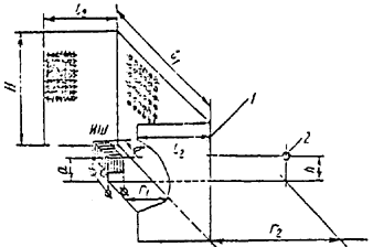Рис. 5. Схема расположения источника (ИШ), излучающего шум в канал, и расчетной точки (РТ), расположенной в защищаемом от шума помещении в другом здании r1 - расстояние от выходного отверстия канала до наружного ограждения защищаемого от шума помещения; r2, r3 - расстояния от центра излучающей поверхности до наружного ограждения защищаемого от шума помещения Суммарное снижение октавного