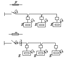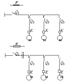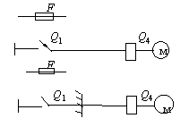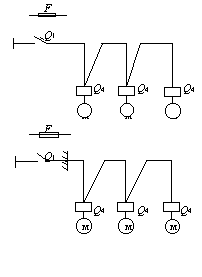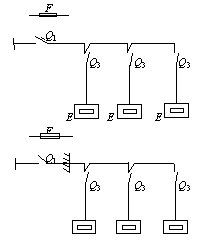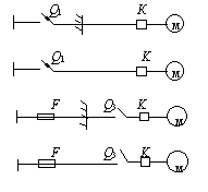 Примечания: 1. Присоединение электроприемников в цепочку осуществляется без разрывов проводов. 2. Экспликация к схемам, приведенным в прил. 2 и 3: ô - распределительный пункт; Q1 - автоматический выключатель, устанавливаемый на распределительном пункте; F - предохранитель, устанавливаемый на распределительном пункте; F1 - предохранитель; Q2 - автоматический выключатель; К - магнитный пускатель; S - выключатель в цепи управления; Q3 - выключатель в главной цепи; м - механический или холодильный токоприемник; Е - тепловой токоприемник; х - электрический соединитель в защищенном исполнении с заземляющим контактом; Q4 - коммутационный аппарат (пускатель, выключатель, рубильник и т. д.), может поставляться комплектно с оборудованием; -- - перегородка. Рекомендуемое приложение 4Расчетные формулы для выбора защитных аппаратов в осветительных и силовых сетях