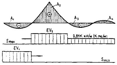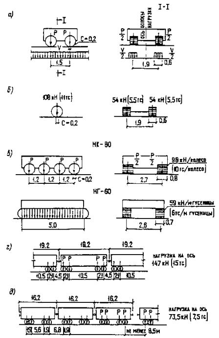 Для промежуточных значений l коэффициенты e следует определять по интерполяции. Примечание. Если кроме коэффициента e в расчетах учитывается динамический коэффициент (1 + m или 1 + 2/3 m), то их произведение не должно приниматься менее единицы. 2.12*. Нормативную временную вертикальную нагрузку от подвижного состава на автомобильных дорогах (общего пользования, внутрихозяйственных в колхозах, совхозах и других сельскохозяйственных предприятиях и организациях), на улицах и дорогах городов, поселков и сельских населенных пунктов следует принимать (с учетом перспективы): а) от автотранспортных средств - в виде полос АК (черт. 1, а), каждая из которых включает одну двухосную тележку с осевой нагрузкой Р, равной 9,81К кН (1К тс), и равномерно распределенную нагрузку интенсивностью n (на обе колеи) - 0,98К кН/м (0,10К тс/м)1. ___________ 1 На всех схемах с - длина соприкасания колеса с покрытием проезжей части (размеры даны в метрах). Нагрузкой АК загружаются также трамвайные пути при их расположении на необособленном полотне. Класс нагрузки К надлежит принимать равным 11 для всех мостов и труб, кроме деревянных мостов на дорогах V категории и внутрихозяйственных дорогах II-c и III-с категорий, для которых он может приниматься равным 8. Элементы проезжей части мостов, проектируемых под нагрузку А8, следует проверять на давление одиночной оси, равное 108 кН (11 тc) (черт. 1, б); б) от тяжелых одиночных колесных и гусеничных нагрузок (черт. 1, в): для мостов и труб, проектируемых под нагрузку A11, - в виде колесной нагрузки (одной четырехосной машины) НК-80 общим весом 785 кН (80 тс); для мостов и труб, проектируемых под нагрузку А8, - в виде гусеничной нагрузки (одной машины) НГ-60 общим весом 588 кН (60 тс); в) от подвижного состава метрополитена с каждого пути - в виде поезда расчетной длины, состоящего из четырехосных вагонов (черт. 1, г) общим весом каждого загруженного вагона 588 кН (60 тс). При загружении линий влияния, имеющих два или более участков одного знака, разделяющие их участки другого знака следует загружать порожними вагонами весом каждый 294 кН (30 тс); г) от трамваев (при расположении трамвайных путей на самостоятельном огражденном или обособленном полотне) с каждого пути - в виде поездов из четырехосных вагонов (черт. 1, д) общим весом каждого загруженного вагона 294 кН (30 тс) и порожнего - 147 кН (15 тс); число вагонов в поезде и расстояние между поездами должны соответствовать самому неблагоприятному загружению при следующих ограничениях: число вагонов в одном поезде - не более четырех; расстояния между крайними осями рядом расположенных поездов - не менее 8,5 м. Загружения моста указанными нагрузками должны создавать в рассчитываемых элементах наибольшие усилия, в установленных нормами местах конструкции - максимальные перемещения (деформации). При этом для нагрузки АК во всех случаях должны быть выполнены условия: при наличии линий влияния, имеющих три или более участков разных знаков, тележкой загружается участок, дающий для рассматриваемого знака наибольшее значение усилия (перемещения), равномерно распределенной нагрузкой (с необходимыми ее перерывами по длине) загружаются все участки, вызывающие усилие (перемещение) этого знака; число полос нагрузки, размещаемой на мосту, не должно превышать установленного числа полос движения; расстояния между осями смежных полос нагрузки должн