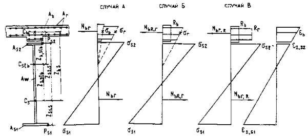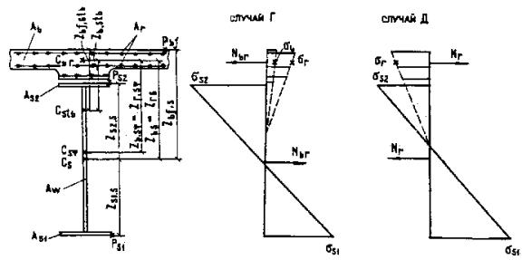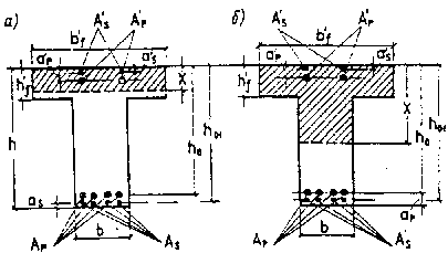 прямоугольных сечений (черт. 2) при М £ Rb bx (h0 - 0,5x) + Rsc A¢s (h01 - a¢s) + spc A¢p (h0 - a¢p), (54) при этом высоту сжатой зоны х следует определять по формуле Rp Ap + Rs As - Rsc A¢s - spc A¢p = Rb bx. (55) Черт. 2. Схема усилий и эпюра напряжений в сечении, нормальном к продольной оси изгибаемого железобетонного элемента, при расчете его по прочности Здесь и в других формулах допускается высоту h0 принимать от равнодействующих усилий в арматуре Аp и Аs. При отсутствии напрягаемой арматуры h0 = h01. Расчет продольного стыка плиты проезжей части ребристых пролетных строений автодорожных и городских мостов на прочность производится с введением к правой части формул (54) и (55) коэффициентов условий работы, равных 0,8 - для бездиафрагменных и 0,9 - для диафрагменных пролетных строений. 3.63. Расчет тавровых,
