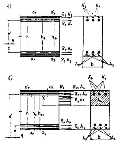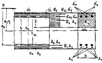 Расчет по прочности сечений, нормальных к продольной оси элемента3.56*. Предельные усилия в сечениях согласно пп. 3.62*-3.71* и 3.75 следует определять исходя из следующих предпосылок: сопротивление бетона растяжению принимается равным нулю; сопротивление бетона сжатию ограничивается напряжениями, равными Rb и равномерно распределенными в пределах условной сжатой зоны бетона; растягивающие напряжения в арматуре ограничиваются расчетными сопротивлениями растяжению в ненапрягаемой Rs и напрягаемой Rp арматуре; сжимающие напряжения в ненапрягаемой арматуре ограничиваются расчетными сопротивлениями сжатию Rsc, а в напрягаемой - наибольшими сжимающими напряжениями spc согласно п. 3.60*; при расчете сечения на общий случай по СНиП 2.03.01-84* деформации (напряжения) в арматуре определяются в зависимости от высоты сжатой зоны бетона с учетом деформаций (напряжений) от предварительного напряжения. Допускается при обосновании в установленном порядке также производить указанные расчеты с использованием диаграмм деформаций бетона и арматуры. Примечание. Для случаев, когда расчетные сопротивления и напряжения в бетоне и арматуре должны вводиться в формулы только в МПа, в тексте даются специальные указания. 3.57*. Если в сжатой зоне расчетного сечения имеются бетоны разных классов, то их площади приводятся пропорционально расчетным сопротивлениям к бетону одного расчетного сопротивления. 3.58. При расчете балок с плитой в сжатой зоне длина свесов плиты, вводимая в расчет, не должна превышать шести ее толщин hf, считая от начала свеса, и должна быть не более половины расстояния в свету между балками, Начало свеса принимается от ребра балки или от конца вута, если он имеет уклон 1:3 и более. При переменной толщине плиты, а также при вутах с уклоном менее 1:3 длина свесов определяется по приведенной толщине плиты, которая находится с учетом площади плиты и вутов. Площадь свесов растянутых поясов двутавровых сечений при расчете не учитывается. 3.59. Если количество растянутой арматуры по конструктивным соображениям или по расчету по трещиностойкости превышает требуемое по расчету по прочности, то в расчете допускается учитывать не всю арматуру, а только требуемую по этому расчету. 3.60*. Напрягаемую арматуру, расположенную в сжатой зоне и имеющую сцепление с бетоном, следует вводить в расчет с напряжением sрс = Rpc - spcl, (51) где Rpc - учитываемое расчетом наибольшее сжимающее напряжение в напрягаемой арматуре согласно п. 3.38; spcl - расчетное напряжение в напрягаемой арматуре (за вычетом всех потерь) при коэффициенте надежности по нагрузке, равном gg = 1,1; при spcl £ Rpc принимается spc = 0. Площадь поперечного сечения сжатой арматуры Аs¢ вводится в расчет в зависимости от соотношения расчетной высоты сжатой зоны бетона х и расстояния аs этой арматуры до сжатой грани сечения. При расчете изгибаемых элементов площадь Аs учитывается полностью, если x2 ³ 2as¢, где x2 - высота сжатой зоны, определенная с учетом сжатой арматуры As¢. Если без учета сжатой арматуры высота сжатой зоны сечения отвечает условию x1 ³ 2as¢, а при учете сжатой арматуры x2 < 2as¢, то расчет на прочность допускается производить, используя условие M £ (Rp Ap + Rs As) (ha - as¢). (52) При х1 < 2аs Аs не учитывается. 3.61*. Расчет сечений, нормальных к продольной оси элемента, когда внешняя сила действует в плоскости оси симметрии сечения и армат