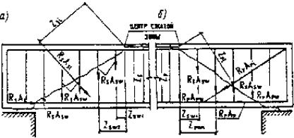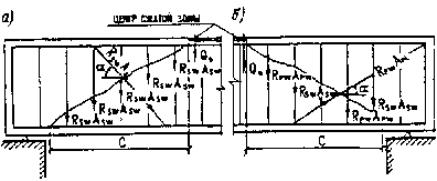 Asw - площадь сечения ветвей хомутов, расположенных в одной плоскости; Sw - расстояние между хомутами по нормали к ним; b - толщина стенки (ребра); h0 - рабочая высота сечения. Коэффициент jbl определяется по формуле jbl = 1 - 0,01 Rb, в которой расчетное сопротивление Rb принимается в МПа. 3.78*. Расчет наклонных сечений элементов с поперечной арматурой на действие поперечной силы (черт. 7) следует производить из условий: для элементов с ненапрягаемой арматурой Q £ S Rsw Asi sin a + S Rsw Asw + Qb + Qrw; (95)* для элементов с напрягаемой арматурой при наличии ненапрягаемых хомутов Q £ S Rpw Api sin a + S Rsw Asw + S Rpw Apw + Qb + Qrw; (96)* Черт. 7. Схема усилий в сечении, наклонном к продольной оси железобетонного элемента, при расчете его по прочности на действие поперечной силы a - с ненапрягаемой арматурой; б - с напрягаемой арматурой В формулах (95)* и (96)*: Q - максимальное значение поперечной силы от внешней нагрузки, расположенной по одну сторону от рассматриваемого наклонного сечения; SRswAsisina, SRswAsw - суммы проекций усилий всей пересекаемой ненапрягаемой (наклонной и нормальной к продольной оси элемента) арматуры при длине проекции сечения с, не превышающей 2h0; SRpwApisina, SRpwApw - то же, в напрягаемой арматуре, имеющей сцепление с бетоном (если напрягаемая арматура не имеет сцепления с бетоном, то значение расчетного сопротивления Rpw следует принять равным установившемуся предварительному напряжению spwl в напрягаемой арматуре); Rsw, Rpw - расчетные сопротивления ненапрягаемой и напрягаемой арматуры с учетом коэффициентов ma4 или mp4, определяемых по п. 3.40; a - угол наклона стержней (пучков) к продольной оси элемента в месте пересечения наклонного сечения; Qb - поперечное усилие, передаваемое в расчете на бетон сжатой зоны над концом наклонного сечения и определяемое по формуле где b, h0 - толщина стенки (ребра) или ширина сплошной плиты и расчетная высота сечения, пересекающего центр сжатой зоны наклонного сечения; с - длина проекции невыгоднейшего наклонного сечения на продольную ось элемента, определяемая сравнительными расчетами согласно требованиям п. 3.79*. m - коэффициент условий работы, равный