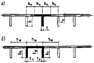 но не менее 1,00; б) для железобетонных балочных пролетных строений, железобетонных сквозных, тонкостенных и стоечных опор, а также звеньев труб при отсутствии засыпки под дорожной одеждой но не менее 1,00; в) для бетонных опор и звеньев труб, грунтовых оснований и всех фундаментов, а при общей толщине засыпки (включая толщину дорожной одежды) не менее 1,0 м - для железобетонных звеньев труб и не менее 0,5 м - для других элементов, перечисленных выше в подпункте «б»,, 1 + m = 1,00; при толщине засыпки (включая толщину дорожной одежды) менее указанной в подпункте «в» значения динамических коэффициентов, перечисленных в подпункте «б»,, принимаются по интерполяции между значениями, принимаемыми по подпунктам «б» и «в»; г) для деревянных конструкций: для элементов 1 + m = 1,10; для сопряжений 1 + m = 1,20. Для колонны автомобилей нагрузки АБ - при расчетах на случай «б» п. 2.13 1 + m = 1,00; 3) к одиночным транспортным единицам для пролетных строений, сквозных, тонкостенных и стоечных опор автодорожных и городских мостов: к нагрузке НК-80: 1 + m = 1,30 при l £ 1,0 м; 1 + m = 1,10 при l ³ 5,0 м; для промежуточных значений l - по интерполяции: к нагрузке НГ-60 1 + m = 1,10; 4) к вертикальным подвижным нагрузкам для пешеходных мостов и к нагрузкам на тротуарах 1 + m = 1,00; 5) к временным горизонтальным нагрузкам и давлению грунта на опоры от транспортных средств железных и автомобильных дорог 1 + m = 1,00; 6) при расчете мостов на выносливость (см. табл. 6) динамическую добавку m, получаемую по формулам (18) - (27) (включая ограничения), следует умножать на 2/3. Величину l (пролета или длины загружения) в формулах следует принимать: а) для основных элементов главных ферм (разрезных балок, арок, рам), а также для продольных и поперечных балок при загружении той части линии влияния, которая определяет их участие в работе главных ферм, - равной длине пролета или длине загружения линии влияния, если эта длина больше величины пролета; б) для основных элементов главных ферм неразрезных систем - равной сумме длин загружаемых участков линий влияния (вместе с разделяющими их участками); в) при расчете на местную нагрузку (при загружении той части линии влияния, которая учитывает воздействие местной нагрузки): продольных балок и продольных ребер ортотропных плит - равной длине их пролета; поперечных балок и поперечных ребер ортотропных плит - равной суммарной длине продольных балок в примыкающих панелях; подвесок, стоек и других элементов, работающих только на местную нагрузку, - равной длине загружения линий влияния: плит балластового корыта (поперек пути) - условно равной нулю; железобетонных плит железнодорожного проезда, укладываемых по металлическим балкам, при расчете плиты поперек пути - равной ширине плиты, при расчете вдоль пути - равной длине панели продольной балки; железобетонных плит автодорожного проезда, укладываемых по металлическим балкам, при расчете плит поперек моста - равной расстоянию между балками, на которые опирается плита; г) при загружении линий влияния, учитывающих одновременно основную и местные нагрузки, - раздельно для каждой из этих нагрузок; д) для элементов опор всех типов - равной длине загружения линии влияния опорной реакции, определяемой как сумма длин загружаемых участков (вместе с разделяющими их участками); е) для звеньев труб и подземных пешеходных переходов - равной ширине звена. Примечание
