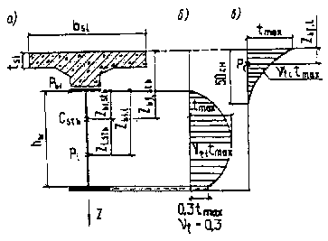 В сечениях, расположенных между хомутами, при b = 90° Qwr = 1000 Awr. 3.79*. Невыгоднейшее наклонное сечение и соответствующую ему проекцию на продольную ось элемента следует определять посредством сравнительных расчетов из условия минимума поперечной силы, воспринимаемой бетоном и арматурой. При этом на участках длиной 2h0 от опорного сечения следует выполнять проверку наклонных сечений с углом наклона к опорному (вертикальному) сечению 45° для конструкций с ненапрягаемой арматурой и 60° - с напрягаемой. При сосредоточенном действии нагрузки вблизи опоры наиболее опасное наклонное сечение имеет направление от нагрузки к опоре. 3.80*. При наличии напрягаемых хомутов угол к продольной оси элемента при дополнительной проверке по наклонным сечениям следует определять по формуле a = arctg где smt - значение главного растягивающего напряжения; tb - значение касательного напряжения. 3.81*. Для железобетонных элементов без поперечной арматуры должно соблюдаться условие Q £ Q + Qwr, (101)* ограничивающее развитие наклонных трещин. 3.82. При расчете растянутых и внецентренно растянутых элементов при отсутствии в них сжатой зоны вся поперечная сила Q должна восприниматься поперечной арматурой. При расчете внецентренно растянутых элементов при наличии сжатой зоны значение Qb, вычисленное по формуле (97*), следует умножить на коэффициент kt, равный: kt = 1 - 0,2 но не менее 0,2 (N - продольная растягивающая сила). Расчет сечений, наклонных к продольной оси элемента, на действие изгибающих моментов3.83*. Расчет наклонных сечений по изгибающему моменту (черт. 8) следует производить, используя условия: для элементов с ненапрягаемой арматурой М £ Rs As zs + S Rs Asw zsw + S Rs Asi zsi; (103) для элементов с напрягаемой арматурой при наличии ненапрягаемых хомутов М £ Rp Ap zp + S Rp Apw zpw + S Rs Asw zsw + S Rp Api zpi, (104) где М - момент относительно оси, проходящей через центр сжатой зоны наклонного сечения, от расчетных нагрузок, расположенных по одну сторону от сжатого конца сечения; zsw, zs, zsi; zpw, zp, zpi - расстояния от усилий в ненапрягаемой и напрягаемой арматуре до точки приложения равнодействующей усилий в сжатой зоне бетона в сечении, для которого определяется момент; остальные обозначения приведены в п. 3.78*. Продольная арматура стенок в расчете не учитывается. Положение невыгоднейшего наклонного сечения следует определять путем сравнительных расчетов, проводимых, как правило, в местах обрыва или отгибов арматуры и в местах резкого изменения сечения. Черт. 8. Схема усилий в сечении, наклонном к продольной оси железобетонного элемента, при расчете его по прочности на действие изгибающего момента а - с ненапрягаемой арматурой; б - с напрягаемой арматурой 3.84*. Для наклонных сечений, пересекающих растянутую грань элемента на участках, обеспеченных от образования нормальных трещин от нормативной нагрузки (при sbt < Rbt) расчет на действие момента допускается не производить. 3.85*. При расчете по прочности на действие момента напрягаемую поперечную арматуру, не имеющую сцепления с бетоном, следует учитывать так же, как при расчете на поперечную cилу по п. 3.78*. Расчет стыков на сдвиг3.86*. Клееные или бетонируемые стыки (плоские или с уступом) в изгибаемых составных по длине конструкциях следует рассчитывать на прочность по сдвигу по формуле Q £ 0,45 msh Na, (105) где Q - максимальное сдвигающее усилие от внешних нагрузок и предварительного на