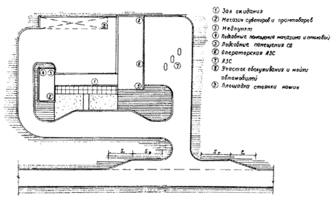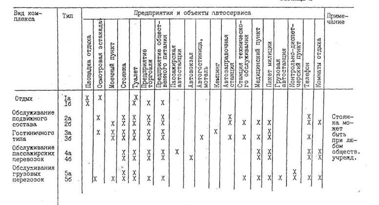 1.5. Перспективный период разработки генеральных схем размещения предприятий и объектов автосервиса, выполняемых на основе настоящих методических указаний, следует принимать равным 10 годам. За начальный год расчетного перспективного периода следует принимать год завершения разработки генеральной схемы или проекта обустройства дороги. 1.6. Методические указания содержат разделы по составу предприятий и объектов автосервиса, их ведомственной принадлежности и функционального значения; требования, предъявляемые к генеральным схемам размещения предприятий и объектов автосервиса на автомобильных дорогах общего пользования, и рекомендации при разработке проектов зданий и сооружений по обслуживанию автомобильного движения, а также указания по организации комплексов. 1.7. При разработке ТЭО и ТЭР автомобильных дорог общего пользования для определения потребности в объектах и предприятиях автосервиса следует руководствоваться разделом 3 настоящих методических указаний. 2. СОСТАВ ПРЕДПРИЯТИЙ И ОБЪЕКТОВ АВТОСЕРВИСА И ИХ ВЕДОМСТВЕННАЯ ПРИНАДЛЕЖНОСТЬ2.1. Автосервис является важной составной частью благоустройства дороги. Он представляет собой совокупность предприятий и сооружений, обеспечивающих полное обслуживание автомобильного движения по дороге, создающих удобства проезжающим, способствующих повышению безопасности движения и эффективности работы автомобильного транспорта. 2.2. Предприятия и объекты автосервиса по функциональному значению могут быть разделены на три группы обслуживания: пассажирских перевозок; подвижного состава; грузовых перевозок. 2.3. К предприятиям и объектам автосервиса, предназначенным для обслуживания пассажирских перевозок, относятся: автобусные остановки, пассажирские автостанции, автовокзалы, автогостиницы, мотели, кемпинги, предприятия общественного питания и торговли, площадки отдыха, площадки-стоянки. 2.3.1. Автобусные остановки, предназначенные для посадки и высадки пассажиров рейсовых автобусов, должны быть оборудованы переходно-скоростными полосами, посадочными площадками, павильонами для ожидания автобусов, а также информационными стендами и мусороприемниками. Автопавильоны представляют собой холодные (неотапливаемые) строения. По виду стеновых ограждений павильоны подразделяются на открытые, полузакрытые и закрытые. Вместимость павильонов 10 и 20 человек. На остановках, расположенных вне населенных пунктов, следует предусматривать туалеты. 2.3.2. Пассажирские автостанции и автовокзалы предназначены для обслуживания пассажиров и водительского состава пригородных и междугородных автобусных маршрутов. В комплекс пассажирских автостанций, кроме зданий, входят перроны для посадки и высадки пассажиров, площадки для стоянки автобусов и легковых автомобилей, проезды для прибытия и отправления автобусов. В здании предусмотрены зал ожидания, кассы, диспетчерская, столовая или буфет, телефон, санузел, медпункт, комнаты отдыха. Вместимость здания пассажирской автостанции - от 10 до 75 человек. Автовокзалы представляют собой комплекс, состоящий из пассажирского здания, внутренней территории с перронами посадки и высадки пассажиров и площадок отстоя автобусов, привокзальной площади с подъездами и стоянками городского транспорта. Вместимость автовокзала - от 100 человек и боле