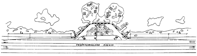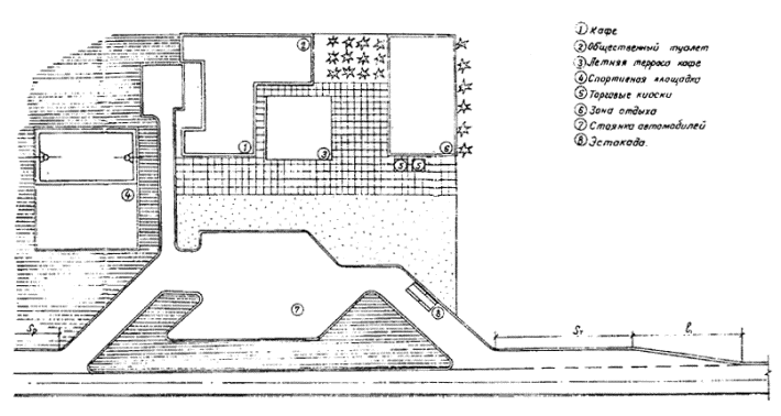 Рис. 11 Пример размещения мотеля с кемпингом (комплекс типа 3-Б) Гостиница расположена над помещениями для стоянки автомобилей. СОДЕРЖАНИЕ