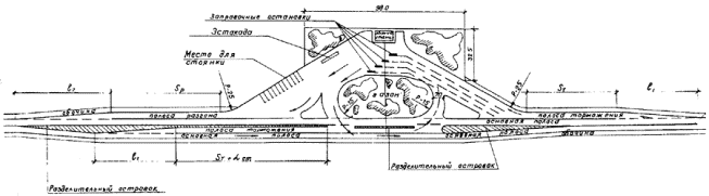 Рис. 5. Пример (схема) размещения площадок различных сооружений на общих с автобусной остановкой полосах торможения и разгона (на дорогах любой категории) Размеры l1, l2, Sт, Sр определяются по СНиП